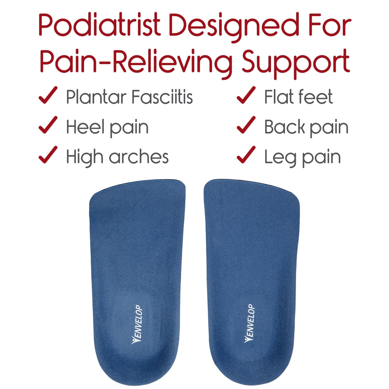 Comfortable and supportive, the 3/4 insoles reduce pain and fatigue while gently correcting foot posture. The proven podiatrist design relieves foot and heel pain, including plantar fasciitis pain and discomfort from flat feet and fallen arches. Perfect for all-day wear, the lightweight 3/4 length insoles leave plenty of room in the toe box for a comfortable, nonslip fit in any shoe style.